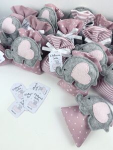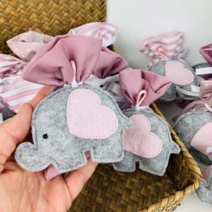 La bomboniera completa comprende : elefantino portachiavi in pannolenci- sacchetto portaconfetti in cotone fantasie miste – tulle e nastrino in raso – biglietto personalizzato e confetti nr. 5 a sacchetto gusto mandorla o cioccolato o misti.