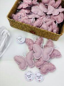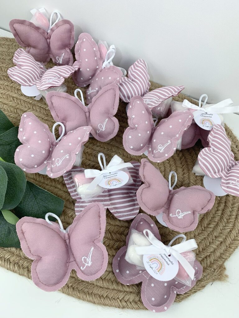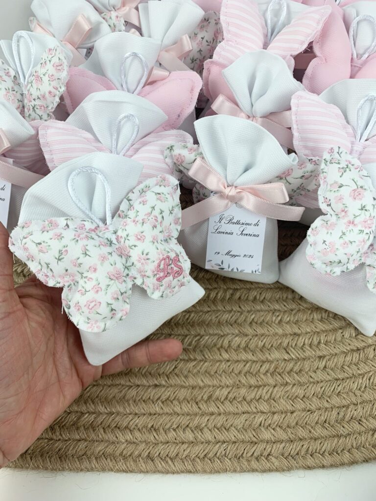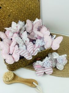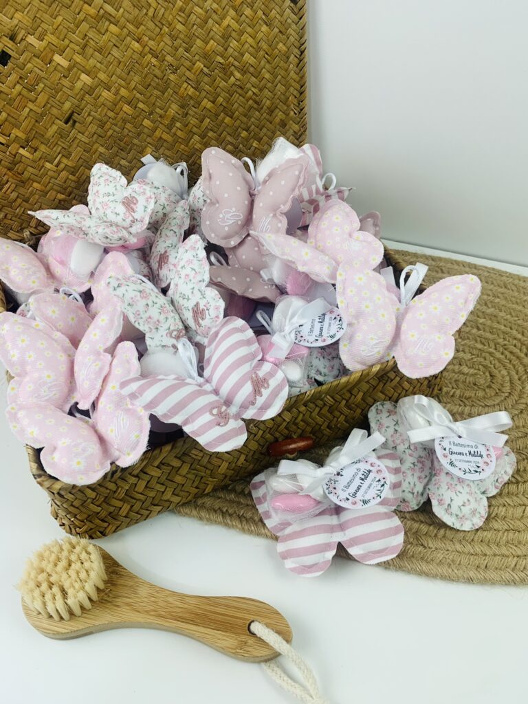 Bomboniera completa con Sacchetto portaconfetti. Comprende:  Farfalla cotone – gancetto o calamita- sacchetto portaconfetti in cotone, tulle o bustina, nastrino in raso,  biglietto personalizzato e confetti nr. 5  gusto mandorla o cioccolato.