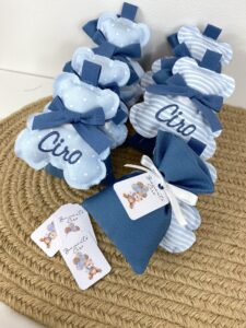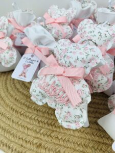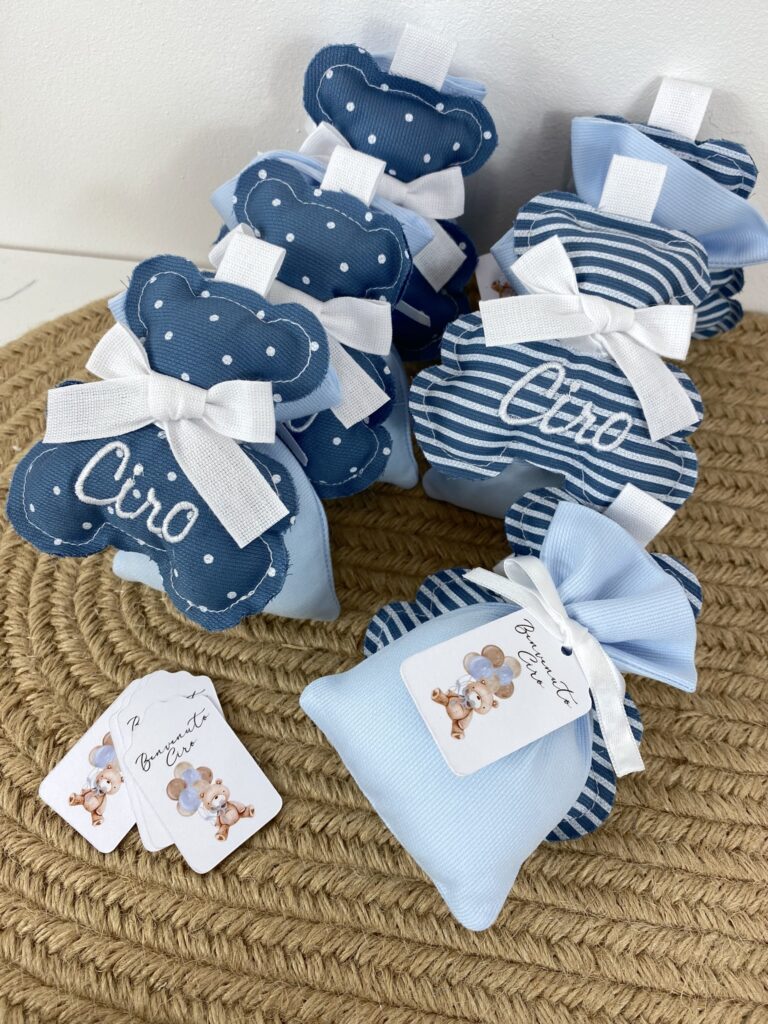 Bomboniera completa. Comprende:  Orsetto con o senza ricamo – tessuto cotone fantasie miste -fiocchetto – sacchetto portaconfetti in cotone- tulle e nastrino in raso – biglietto personalizzato e confetti nr. 5 a sacchetto gusto mandorla o cioccolato.