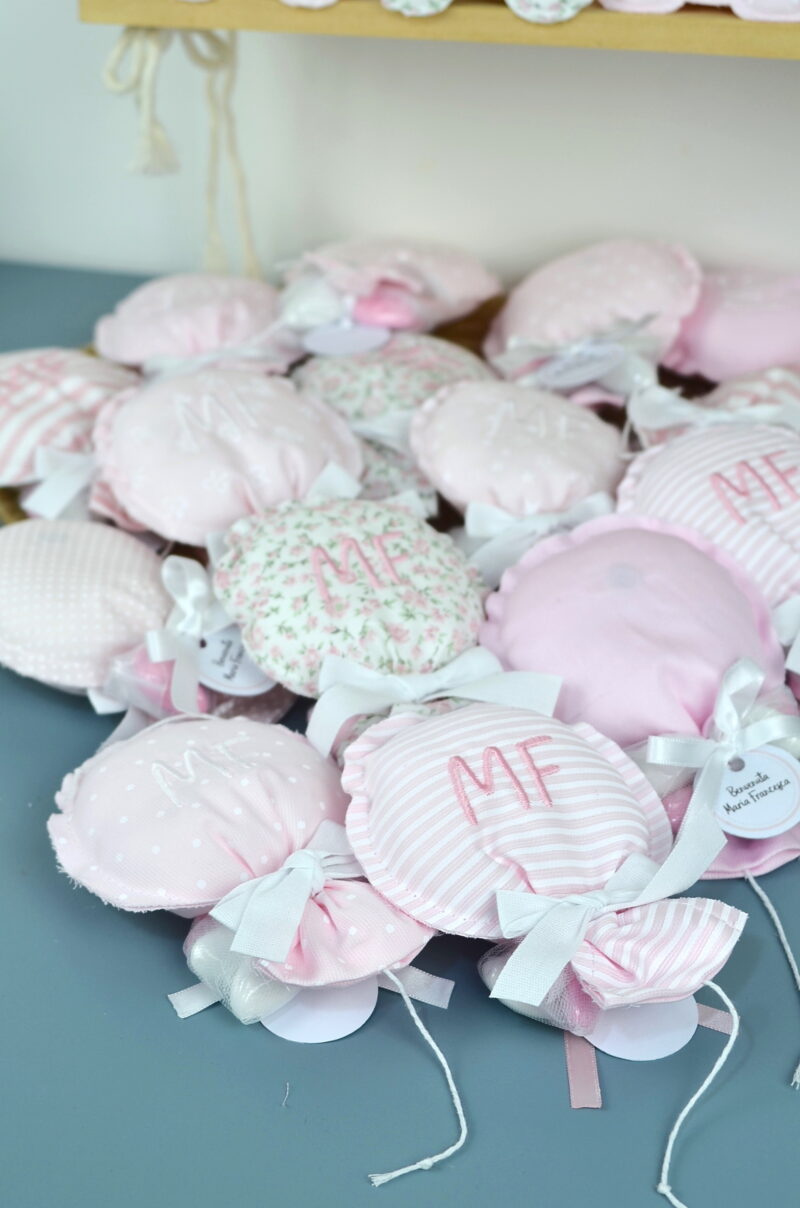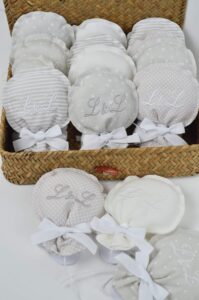 Bomboniera con fiocchetto in tulle. Comprende:  Palloncino con ricamo iniziale , nome o parola– tessuto cotone fantasie miste -fiocchetto e laccetto – fiocchetto in tulle e nastrino in raso posizionato sul retro del palloncino – biglietto personalizzato e confetti nr. 5 a sacchetto gusto mandorla o cioccolato.