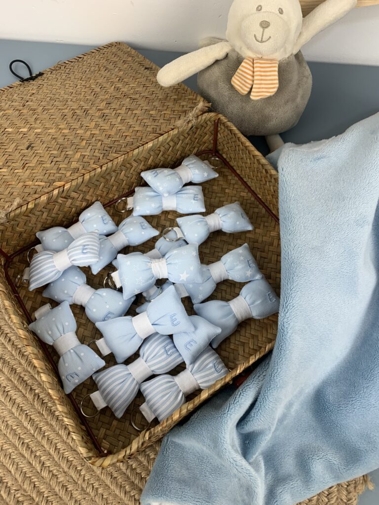 Bomboniera completa con fiocchetto in tulle. Comprende:  Papillon cotone – gancetto e anellino metallo- fiocchetto in tulle su retro con nastrino ,  biglietto personalizzato e confetti nr. 5 a bustina gusto mandorla o cioccolato.