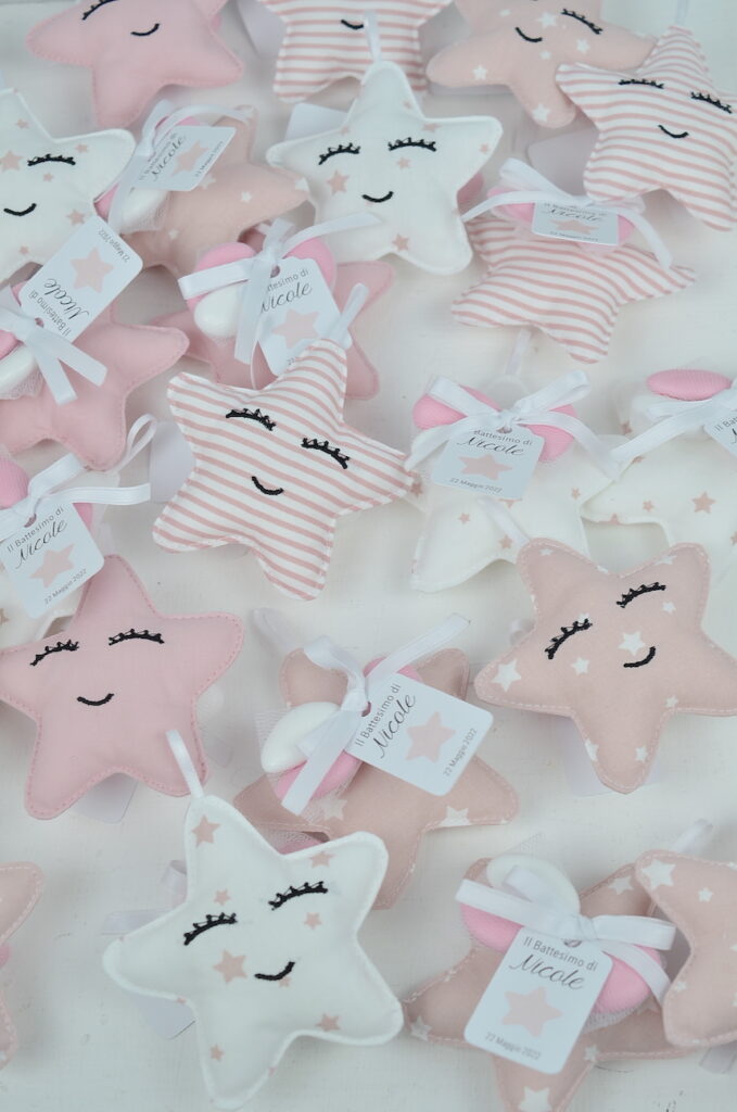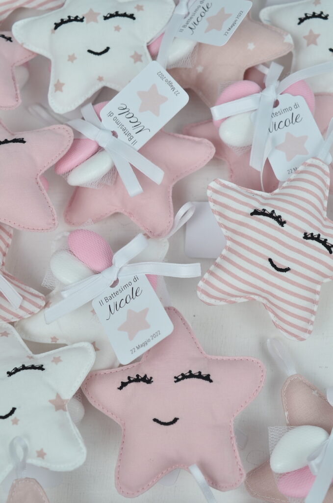 Bomboniera completa con Fiocchetto in tulle. Comprende:  Stellina cotone – visino ricamato- gancetto o calamita-  tulle e nastrino in raso,  biglietto personalizzato e confetti nr. 5  gusto mandorla o cioccolato.
