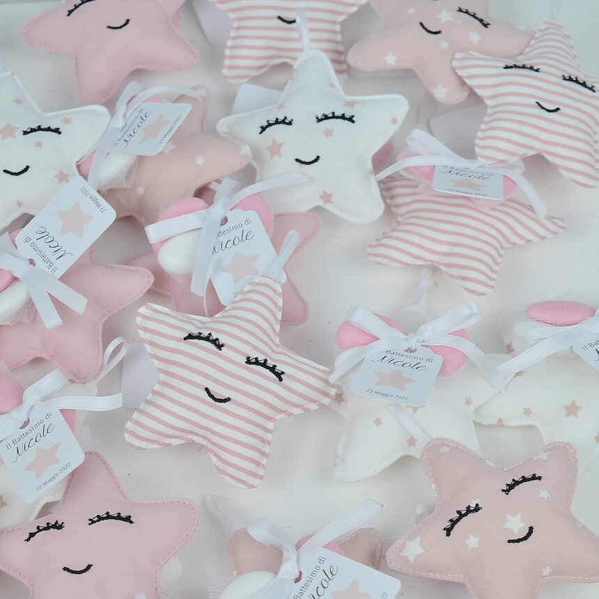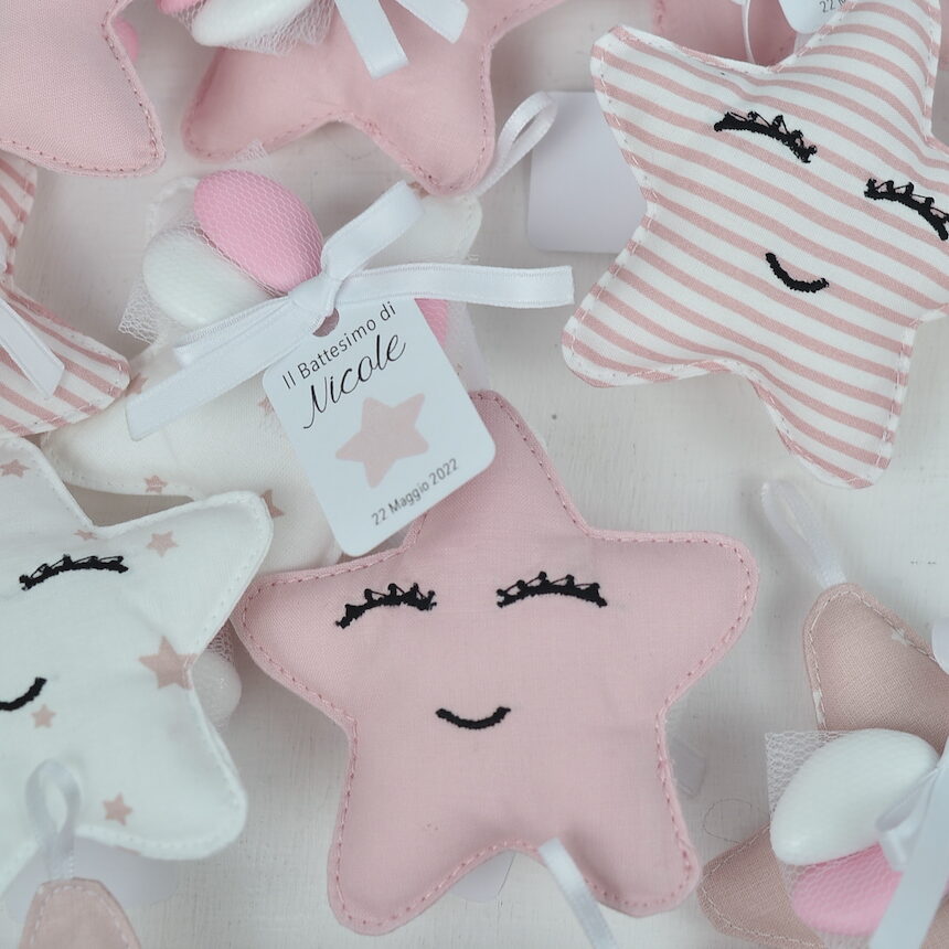 Bomboniera completa con Fiocchetto in tulle. Comprende:  Stellina cotone – visino ricamato- gancetto o calamita-  tulle e nastrino in raso,  biglietto personalizzato e confetti nr. 5  gusto mandorla o cioccolato.