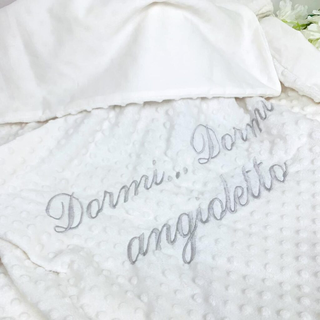 Per la definizione dei colori, font ricamo e disegni ti contatterò io dopo aver ricevuto l’ordine. Nelle foto puoi già vedere alcuni esempi.