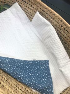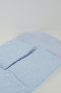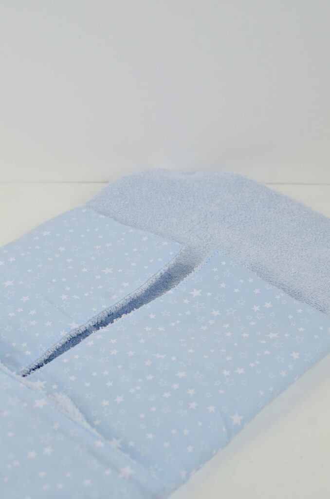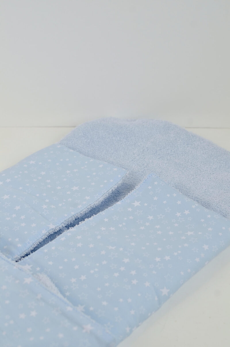 Realizzato in cotone per esterno e con morbida imbottitura all’interno per permettere di appoggiare il bambino su una superficie morbida.