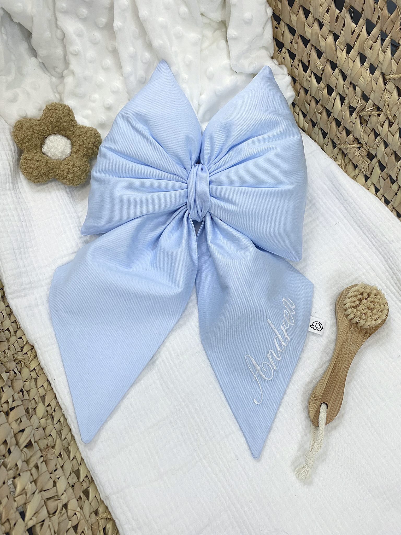 OPZIONE COME DA FOTO: Inserisci nome da ricamare , scegli il fiocco tra le foto proposte e aggiungi al carrello.