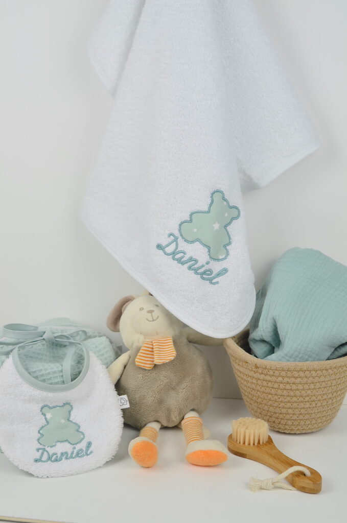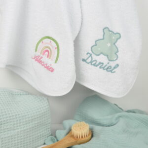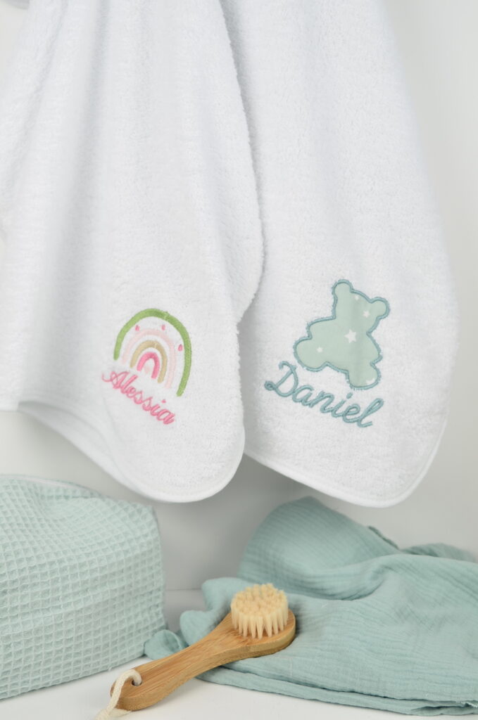 Avvolgente e morbido, assorbe e si asciuga con facilita’. Puo’ essere personalizzato con nome ricamato o iniziale ricamata o con disegno.