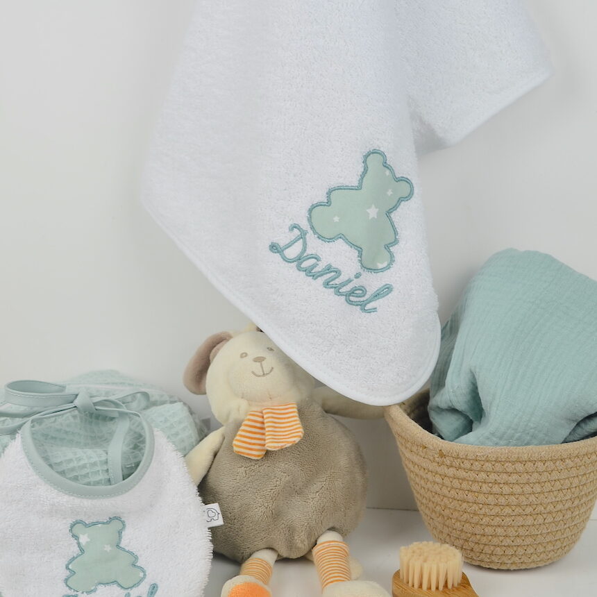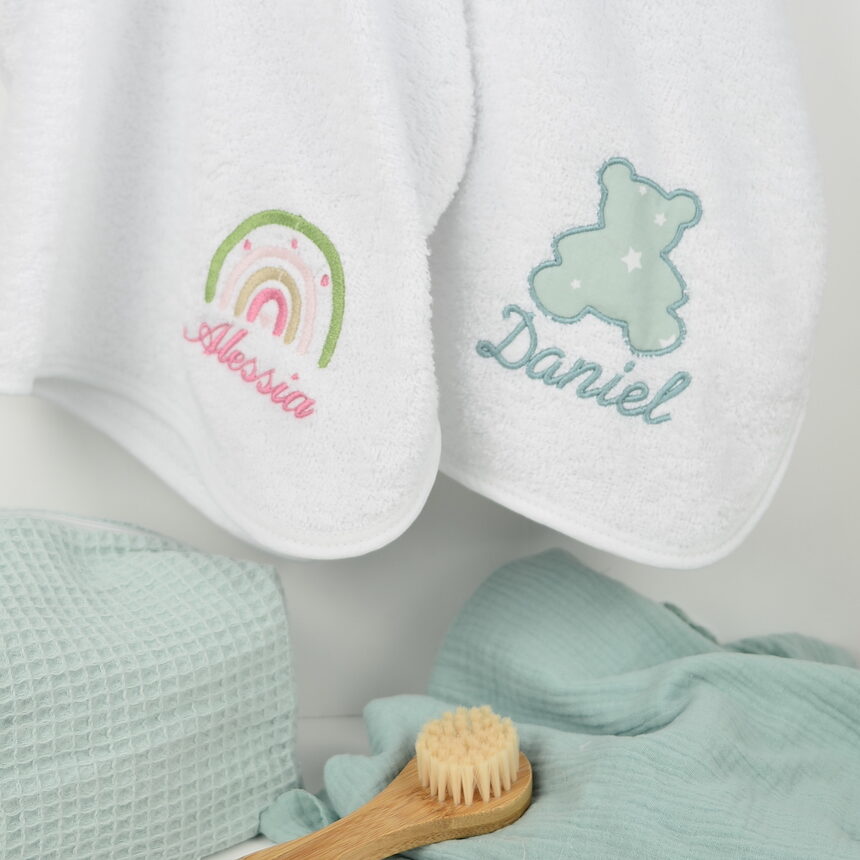 Avvolgente e morbido, assorbe e si asciuga con facilita’. Puo’ essere personalizzato con nome ricamato o iniziale ricamata o con disegno.