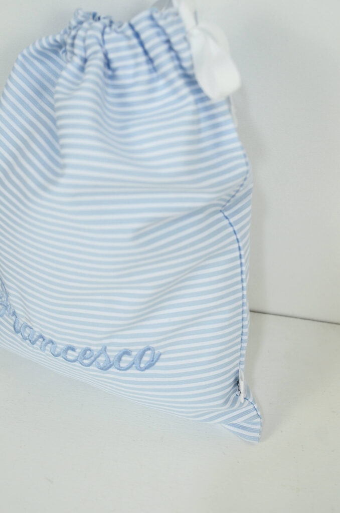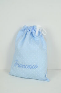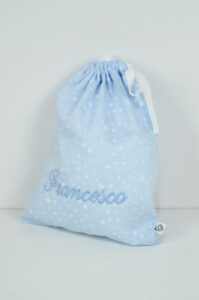 Sacco cambio realizzato a Mano con tessuto in cotone. Offre comfort e praticità sia alla mamma che al neonato. Da utilizzare come sacchetto dove riporre il primo cambio da portare in ospedale , per ricordare i primi giorni del neonato, ma utilizzabile anche in futuro come porta cambio per l’asilo.