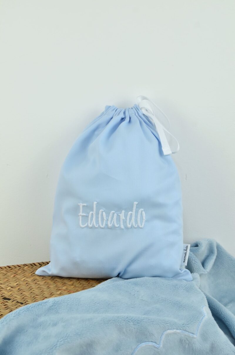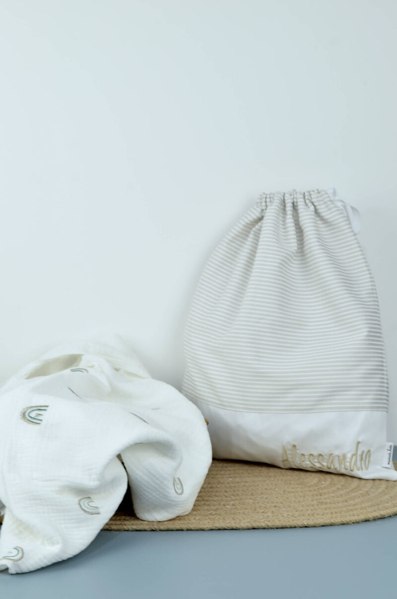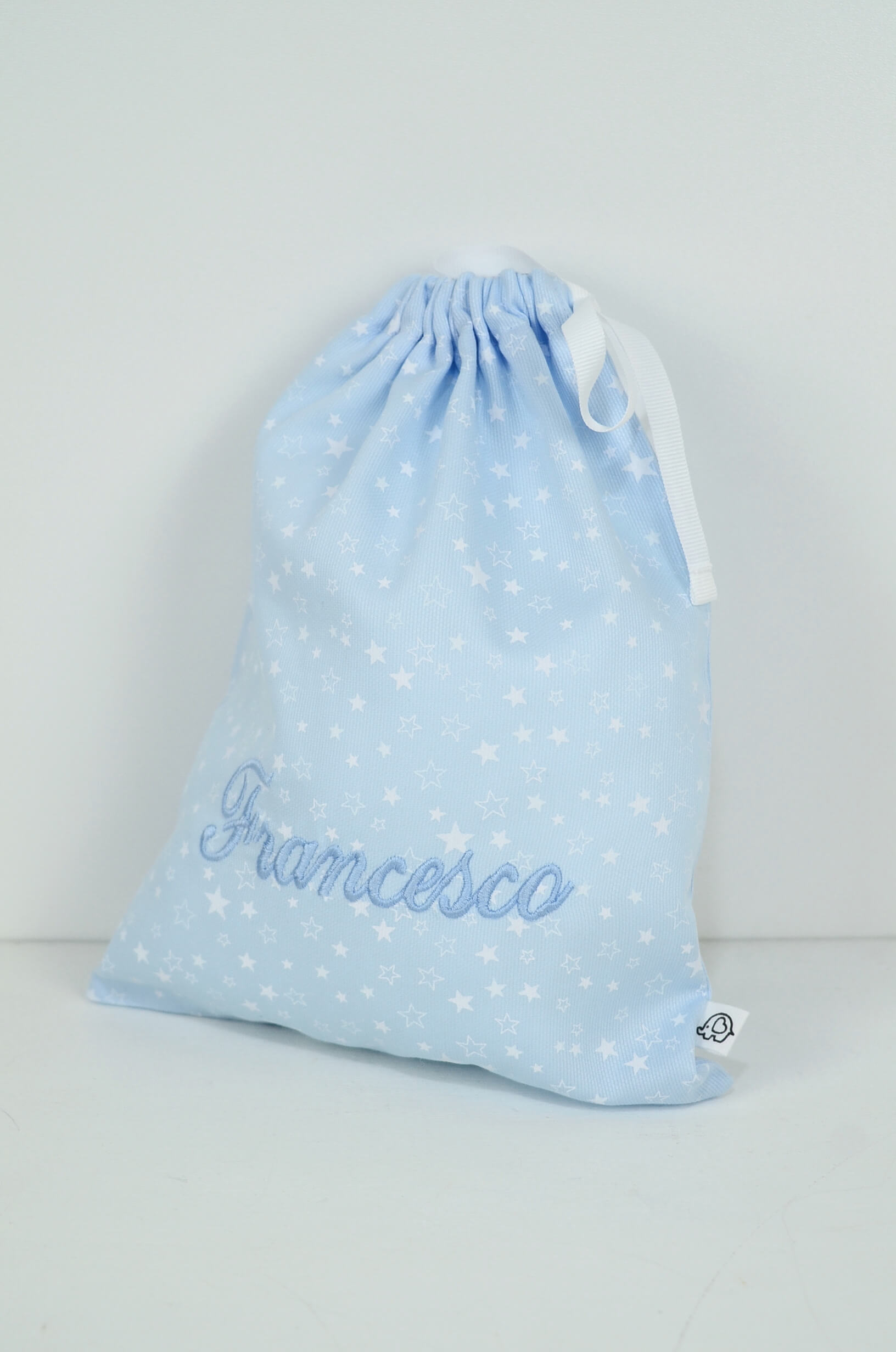Sacco cambio realizzato a Mano con tessuto in cotone. Offre comfort e praticità sia alla mamma che al neonato. Da utilizzare come sacchetto dove riporre il primo cambio da portare in ospedale , per ricordare i primi giorni del neonato, ma utilizzabile anche in futuro come porta cambio per l’asilo.