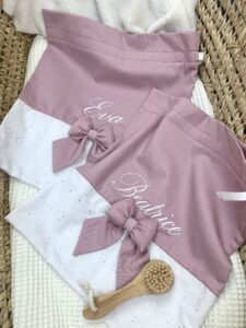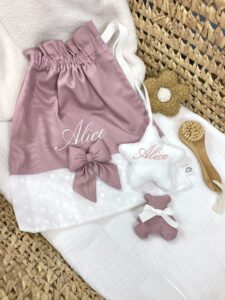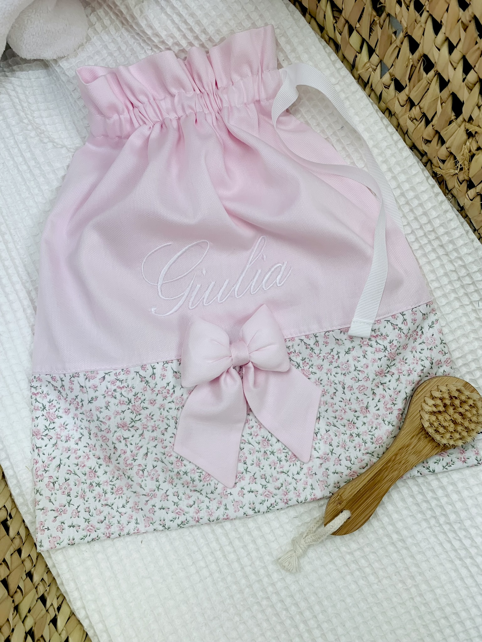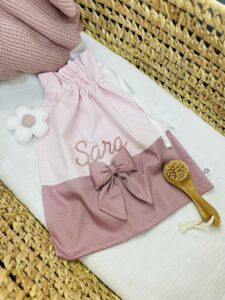Da utilizzare come sacchetto dove riporre il primo cambio da portare in ospedale , per ricordare i primi giorni del neonato e riutilizzabile anche in futuro come porta cambio per l’asilo o la scuola materna.