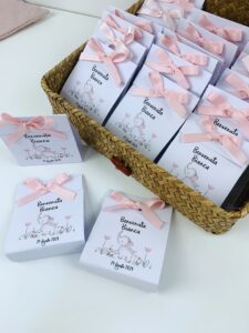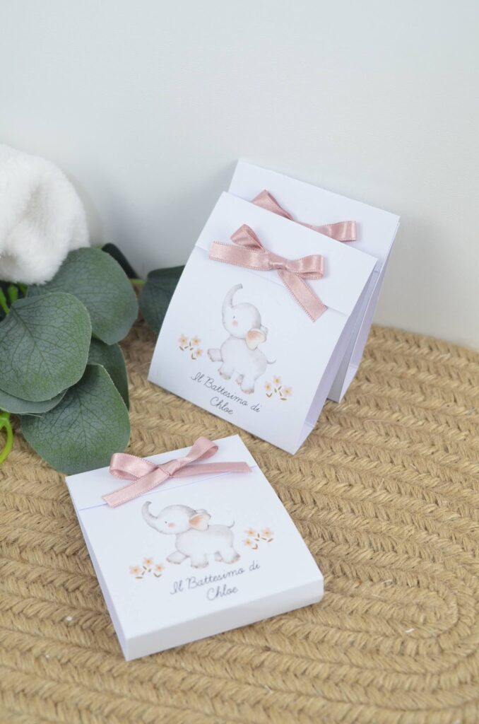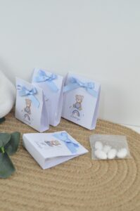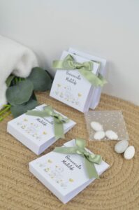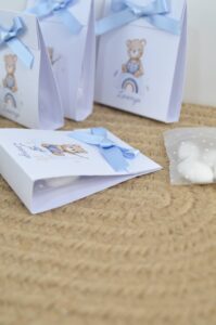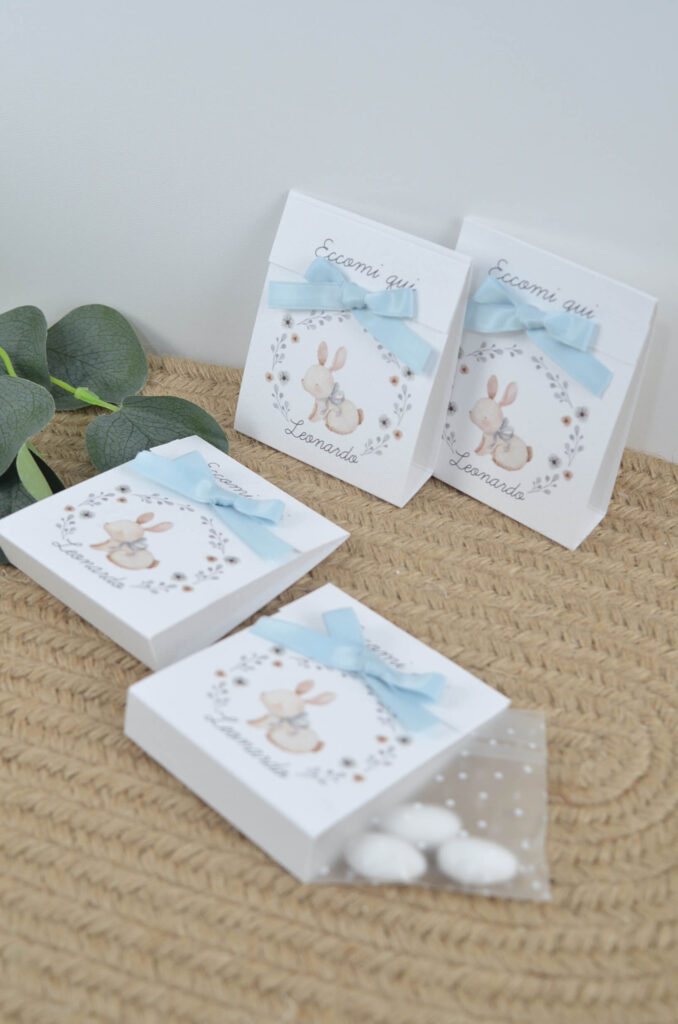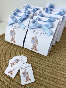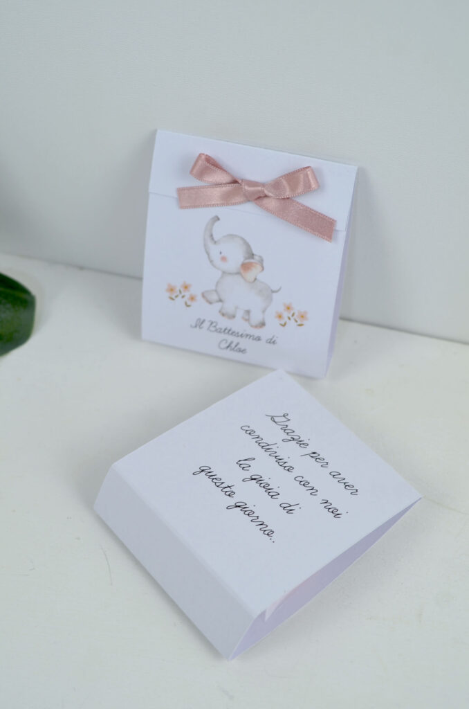 – Cartoncino personalizzato assemblato- bustina interna con 5 confetti e chiuso con fiocchetto.