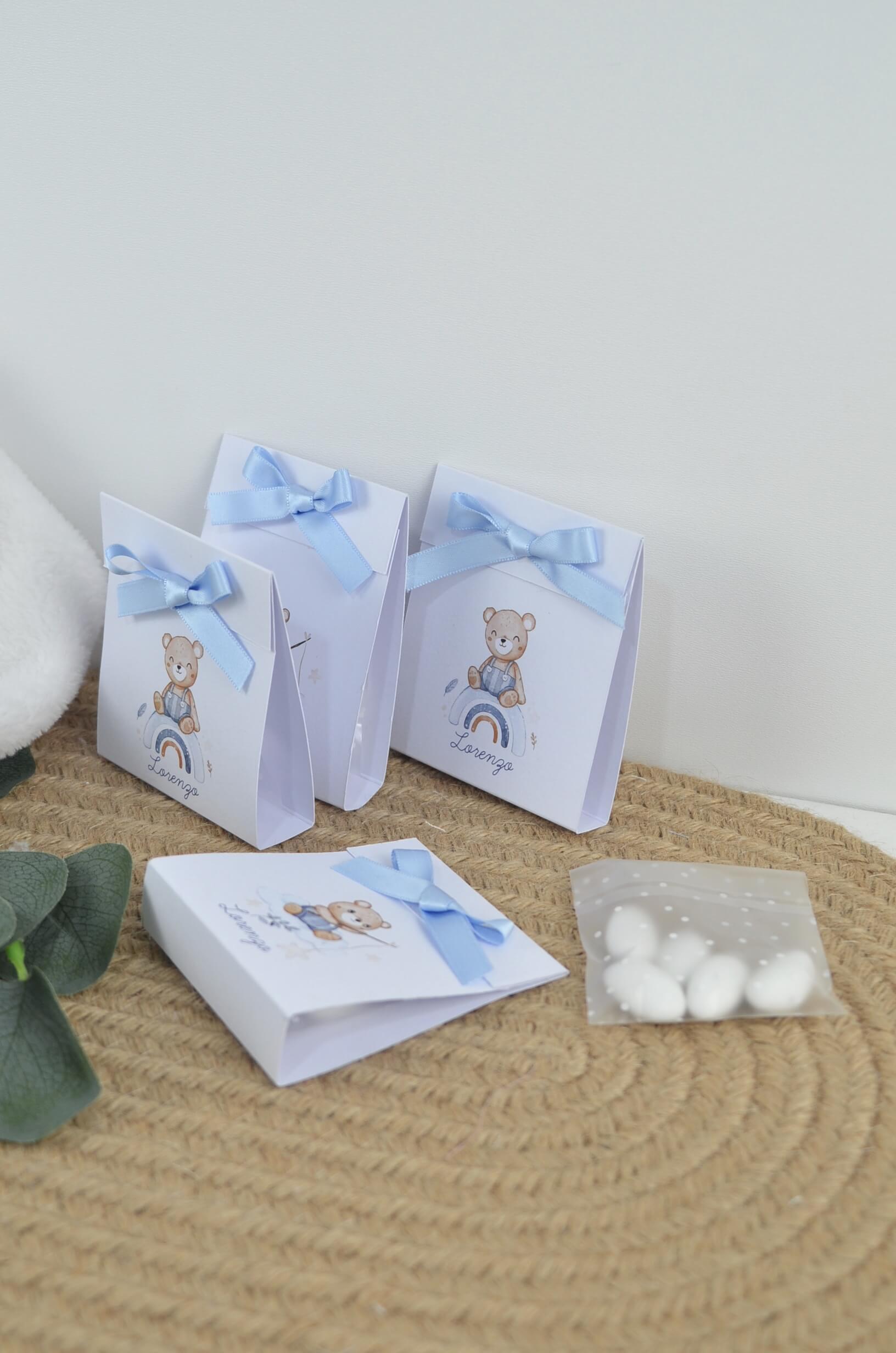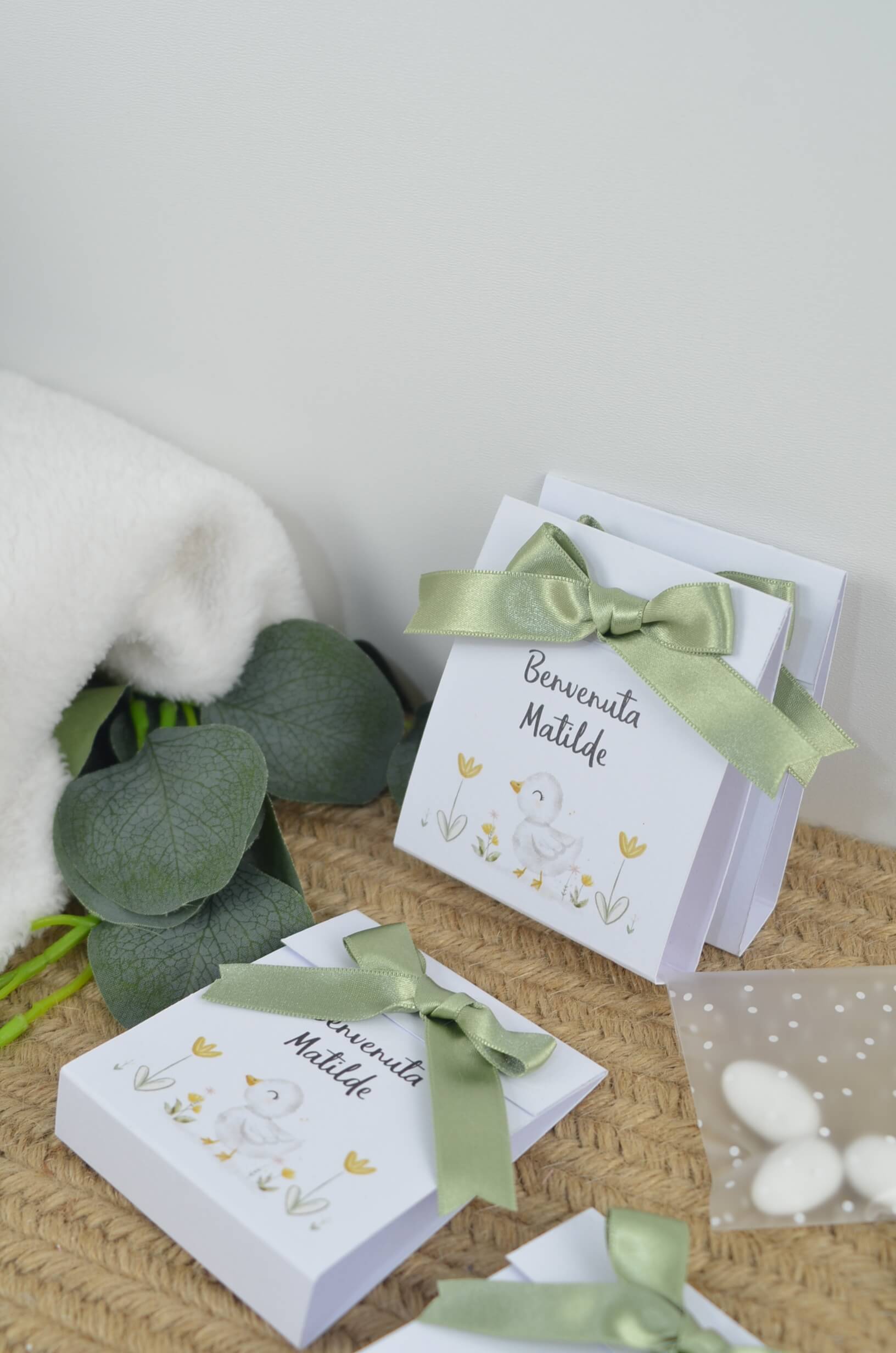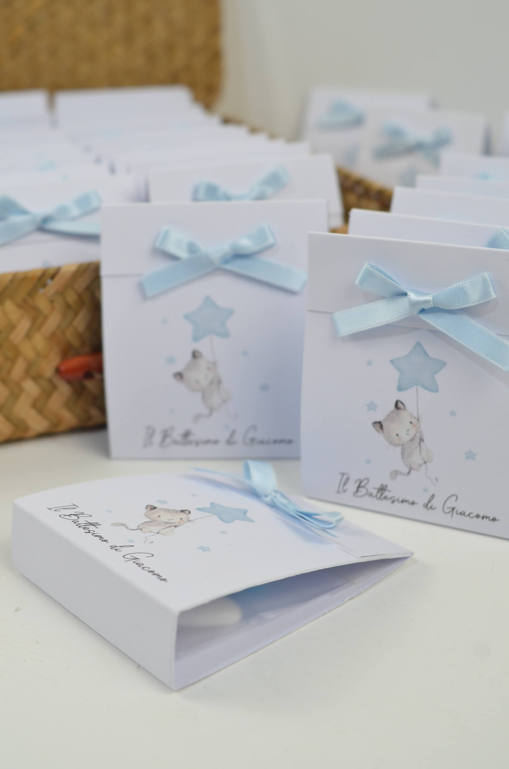 – Cartoncino personalizzato assemblato- bustina interna con 5 confetti e chiuso con fiocchetto.