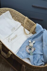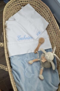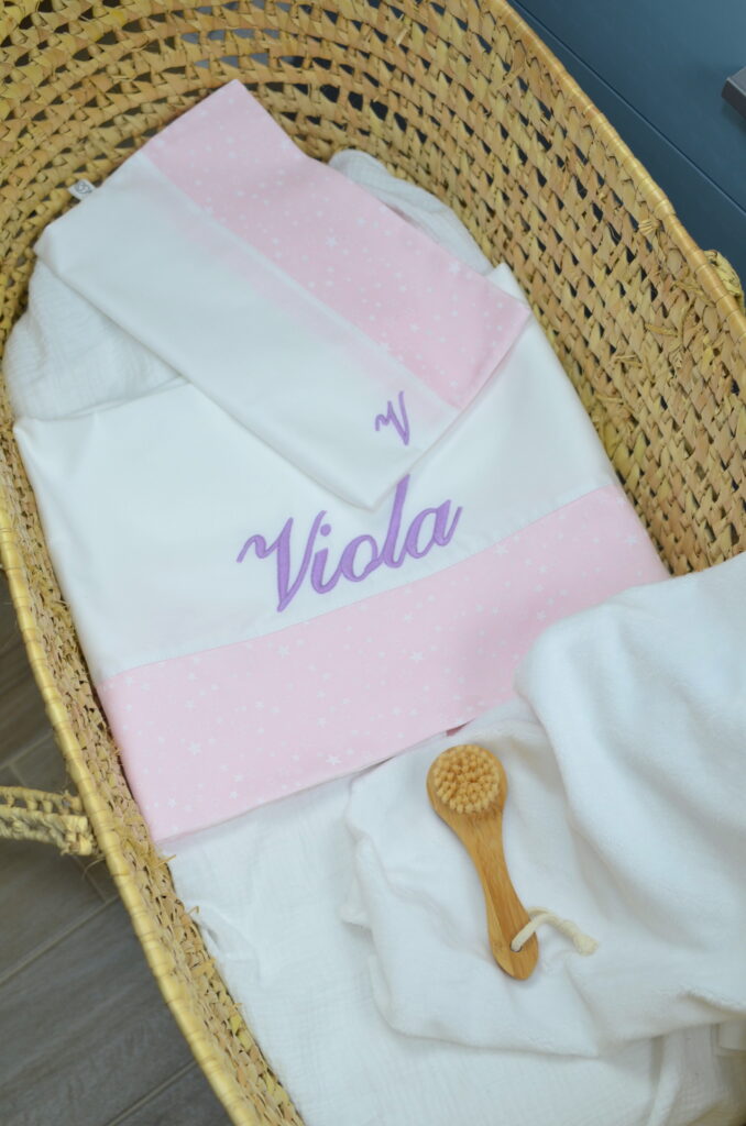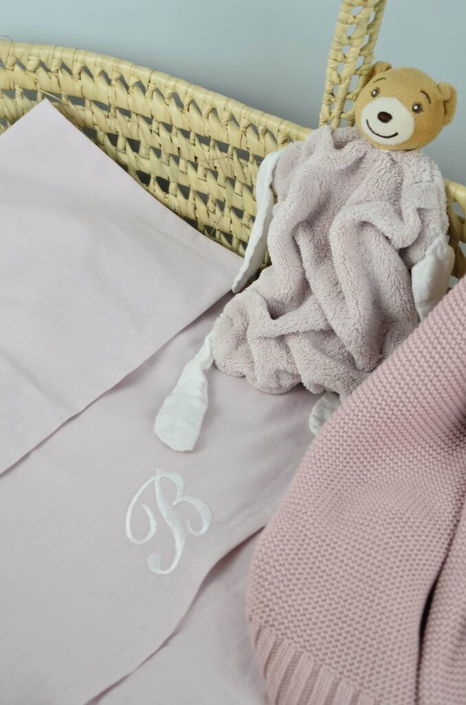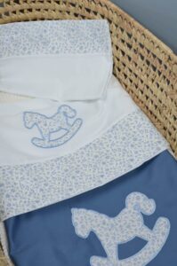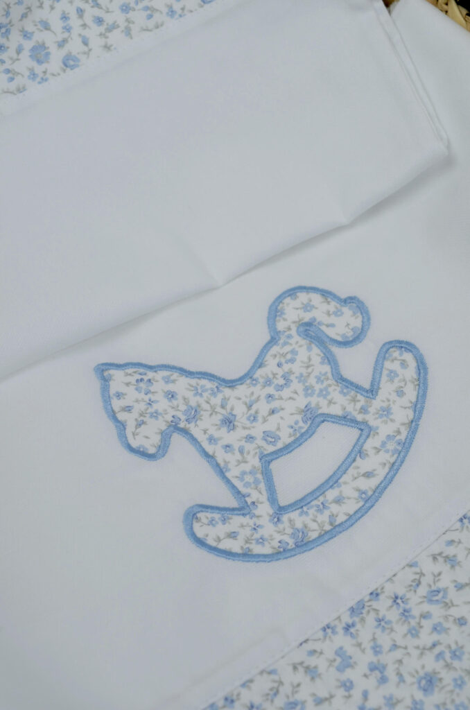 Set Lenzuola in Cotone, composto da : lenzuolo con nome ricamato, federa cuscino con inziali ricamate o senza ricamo e lenzuolo sotto con angoli ed elastico.