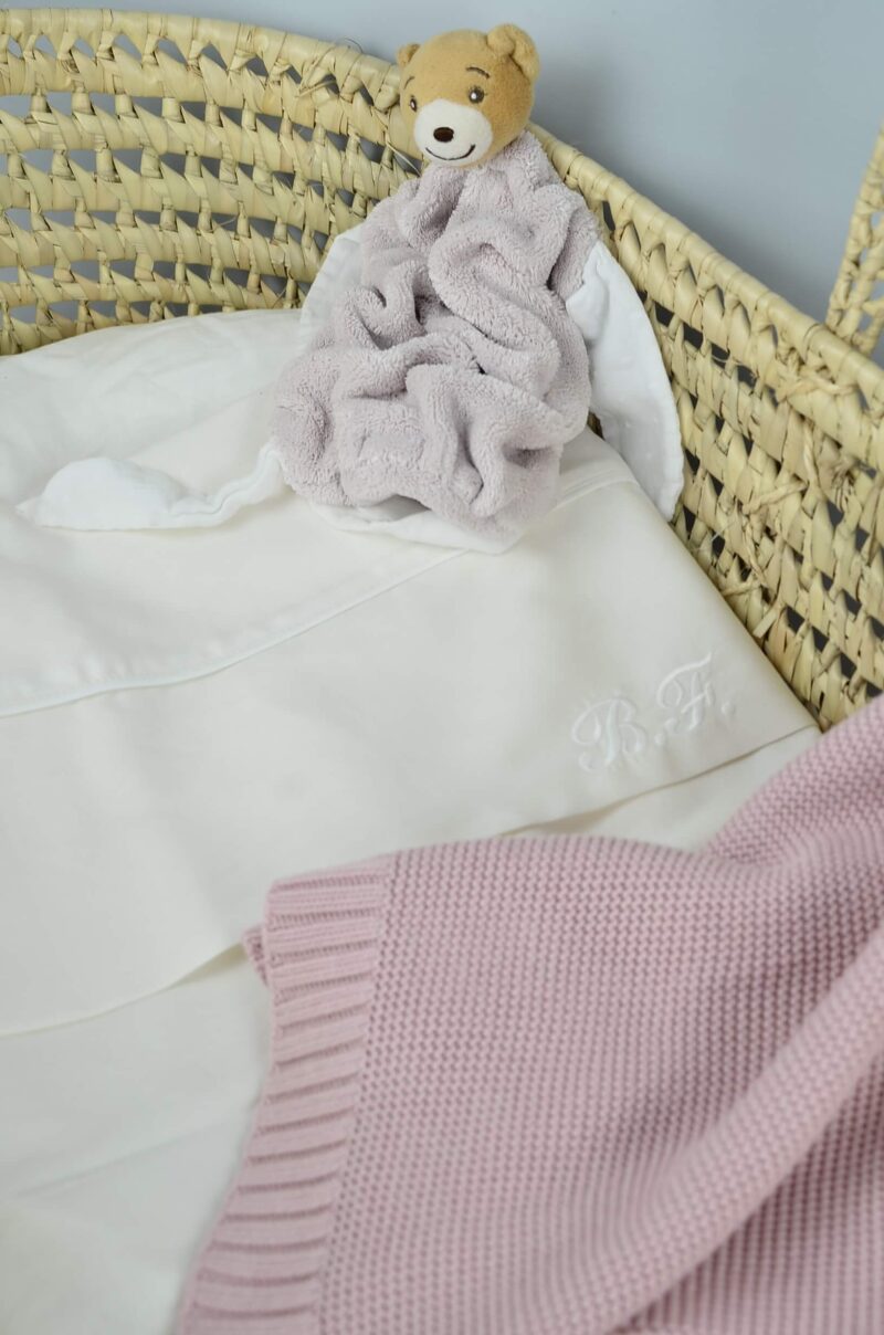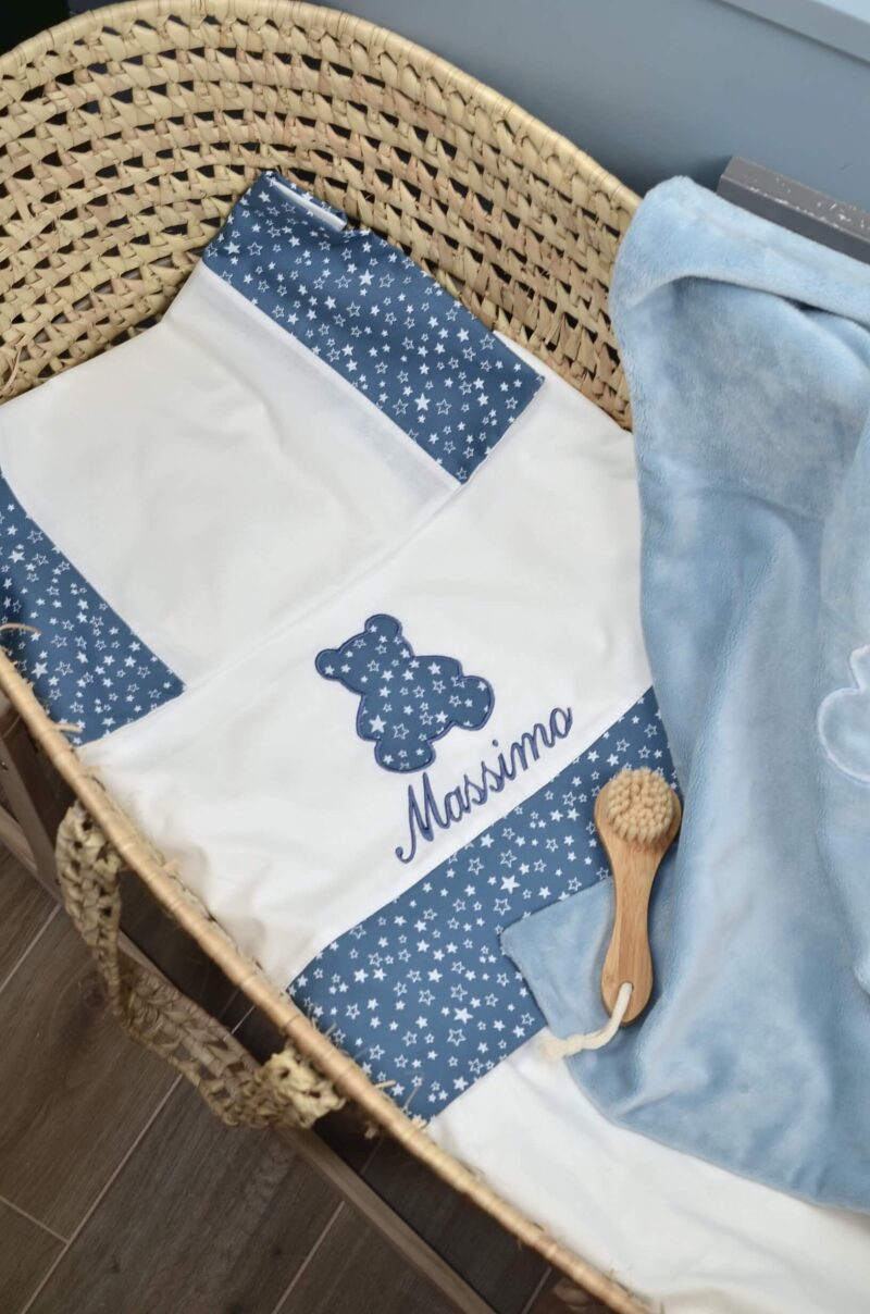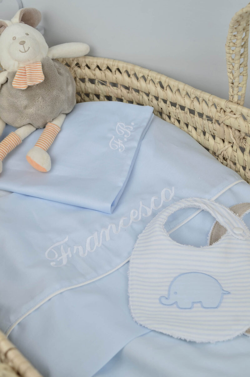 Set Lenzuola in Cotone, composto da : lenzuolo con nome ricamato, federa cuscino con inziali ricamate o senza ricamo e lenzuolo sotto con angoli ed elastico.